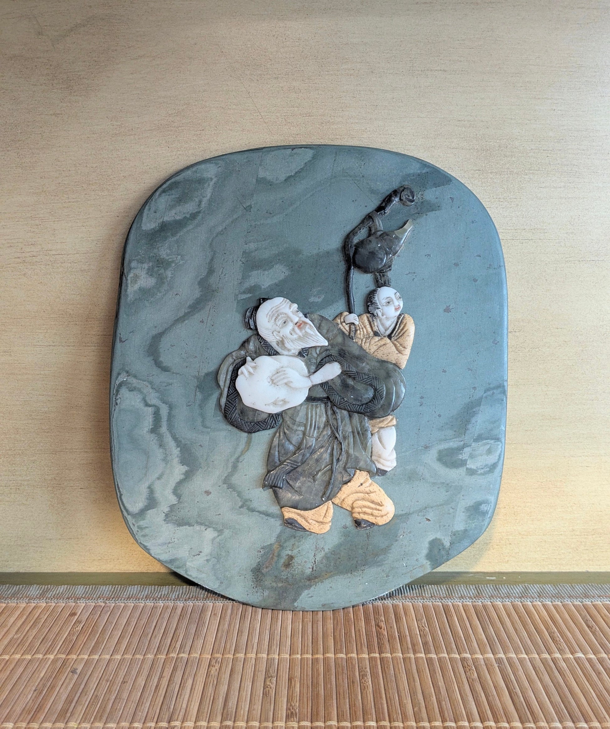 Traveling Man Treasures Curiosity Vault is selling this exquisite 1920s jade and soapstone plaque featuring an old man and a woman holding a staff. The green soapstone base is inlaid with jade and other colorful stone materials, and stands out as a true embodiment of Chinese Republic Period craftsmanship. Most similar styled pieces are inlaid upon wood, but this is inlaid upon a nice slab of smoothly sanded raw-edge soapstone.