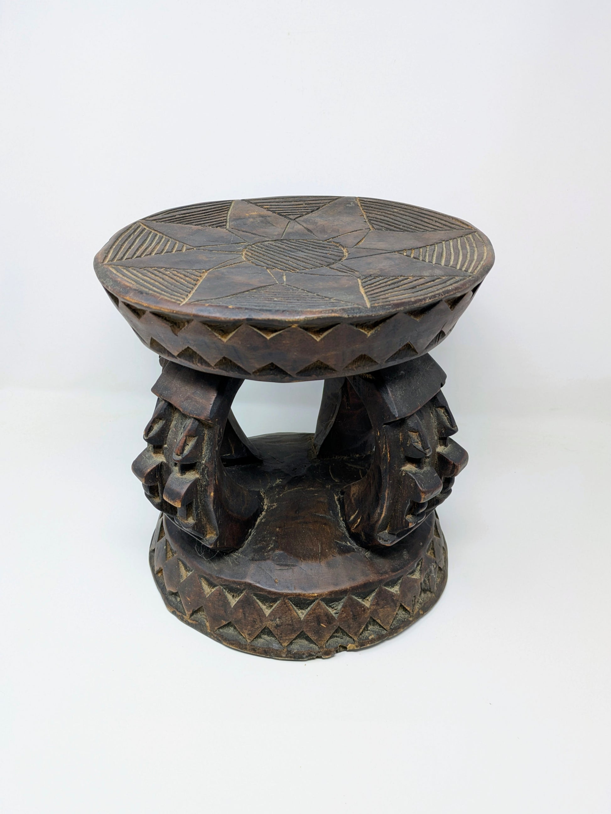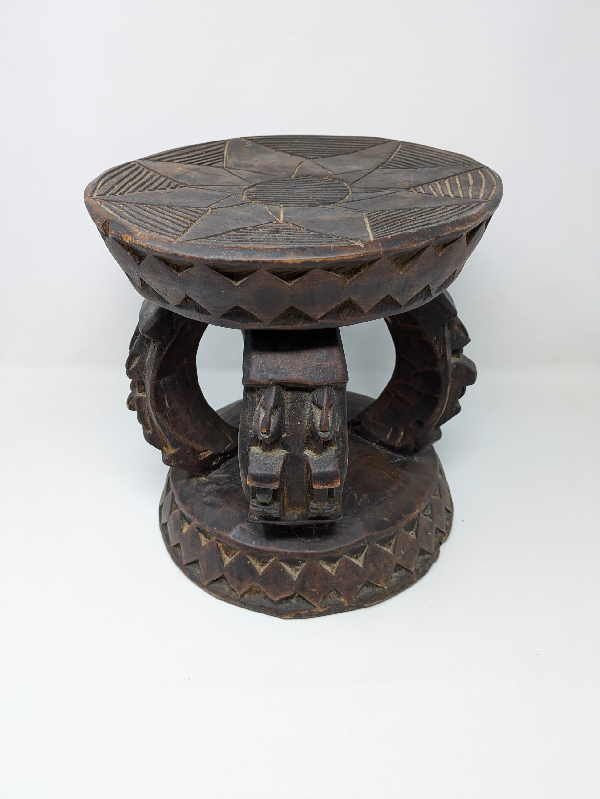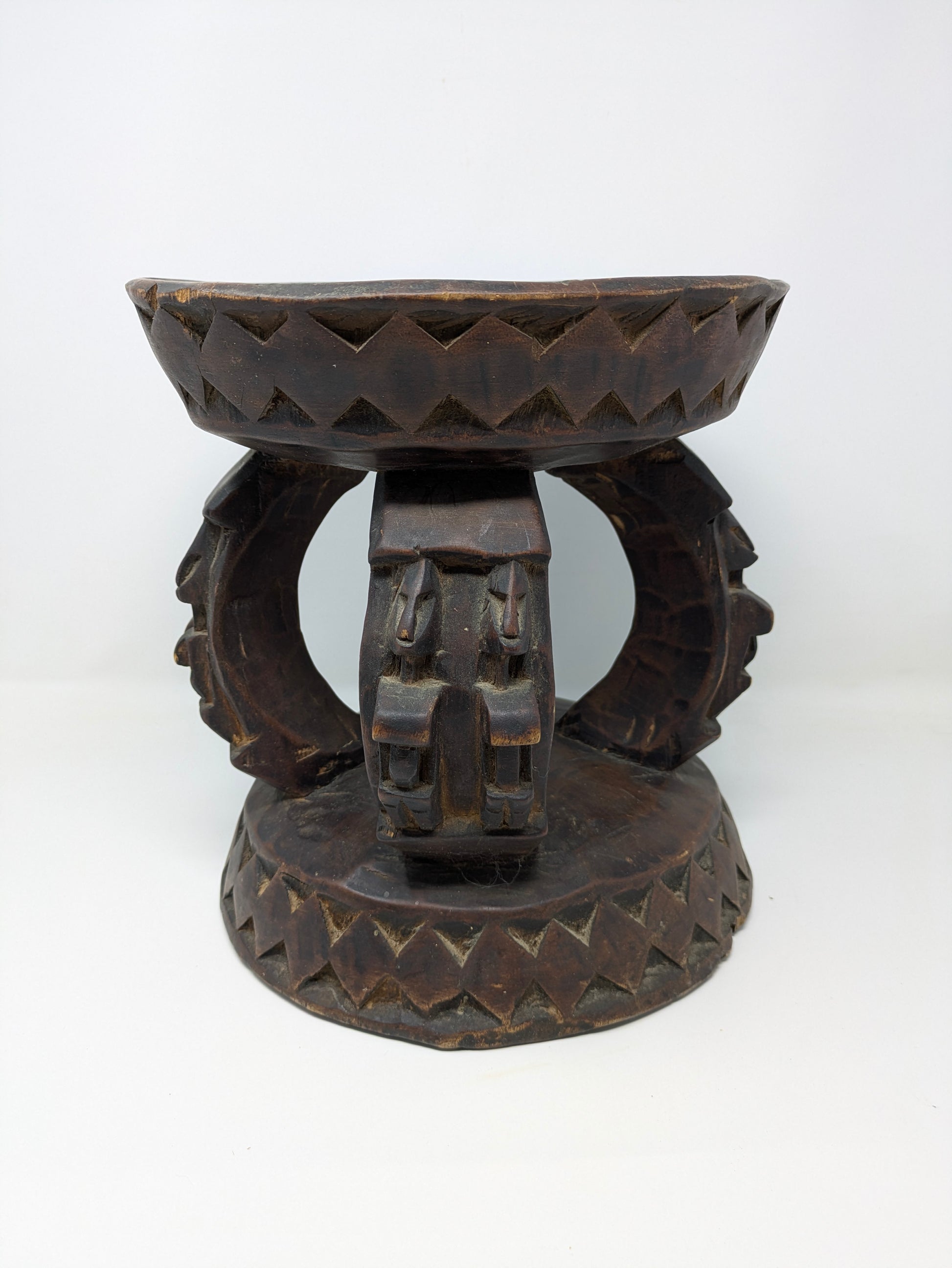 Wooden stools serve the Dogon people for everyday use. This stool is supported by Ancestor Figures or nommo. These figures were originally symbols of authority for the priests or a leading Dogon spiritual leader in the village. This stool with a post in the middle are linked with Dogon mythology. The seat represents heaven, the base represents the earth, and the post represents a tree, linking the two. This is a a very unique stool that would be a wonderful addition to your collection or home.