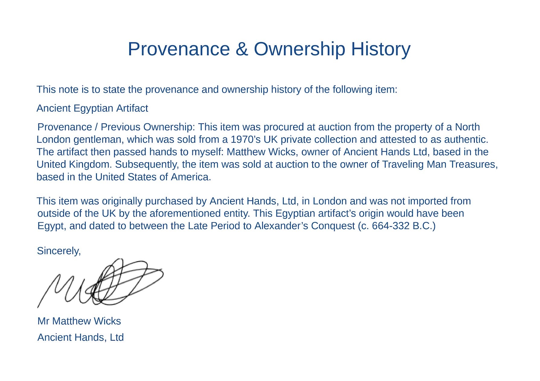 This Egyptian ring is attested to as authentic and to have been made in Egypt during the “Grand Tour/Egyptian Revival” era by Mr Matthew Wicks of Ancient Hands, Ltd, and is accompanied by a digitally signed PDF copy of its "Provenance & Ownership" documentation.