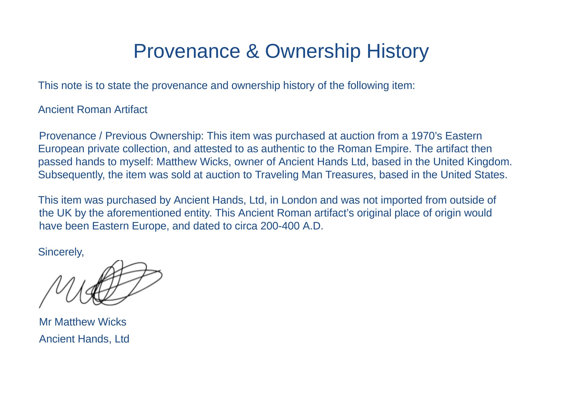 This ancient artifact has been attested as authentic to the Roman Empire (c. 200-400 A.D.) by Mr. Matthew Wicks of Ancient Hands LTD, and accompanied by a signed digital PDF copy of the ring's “Provenance & Ownership” documentation.