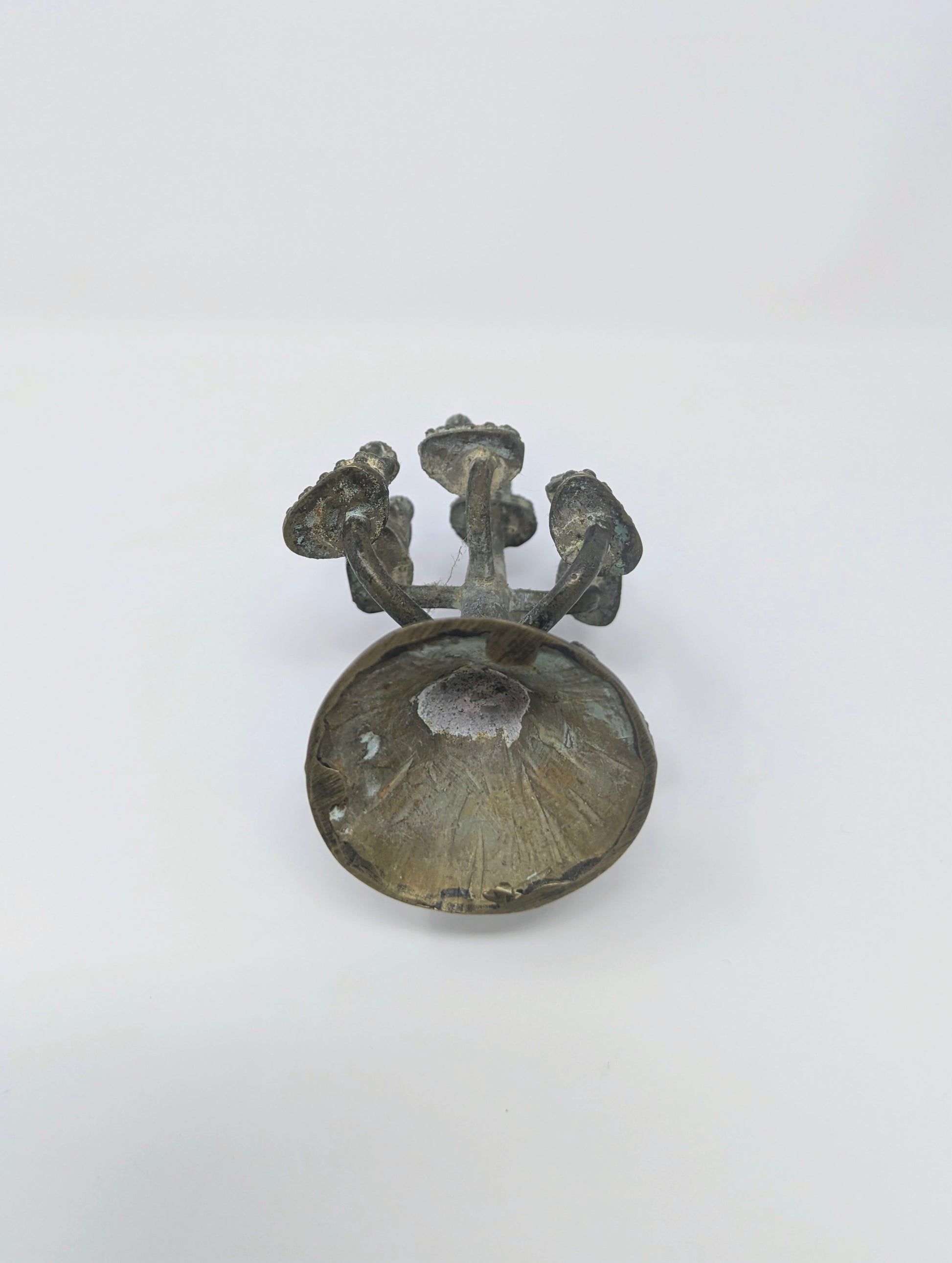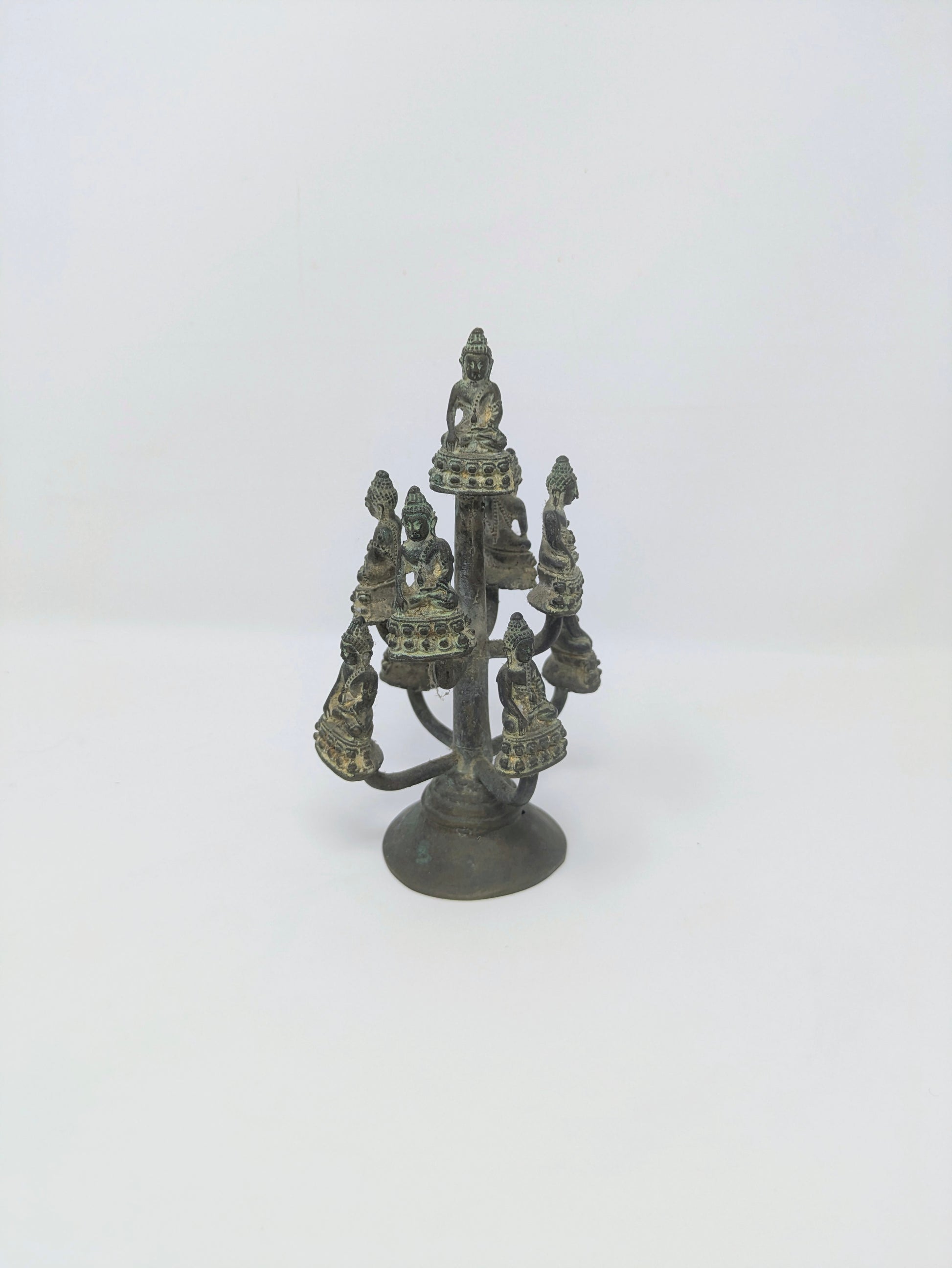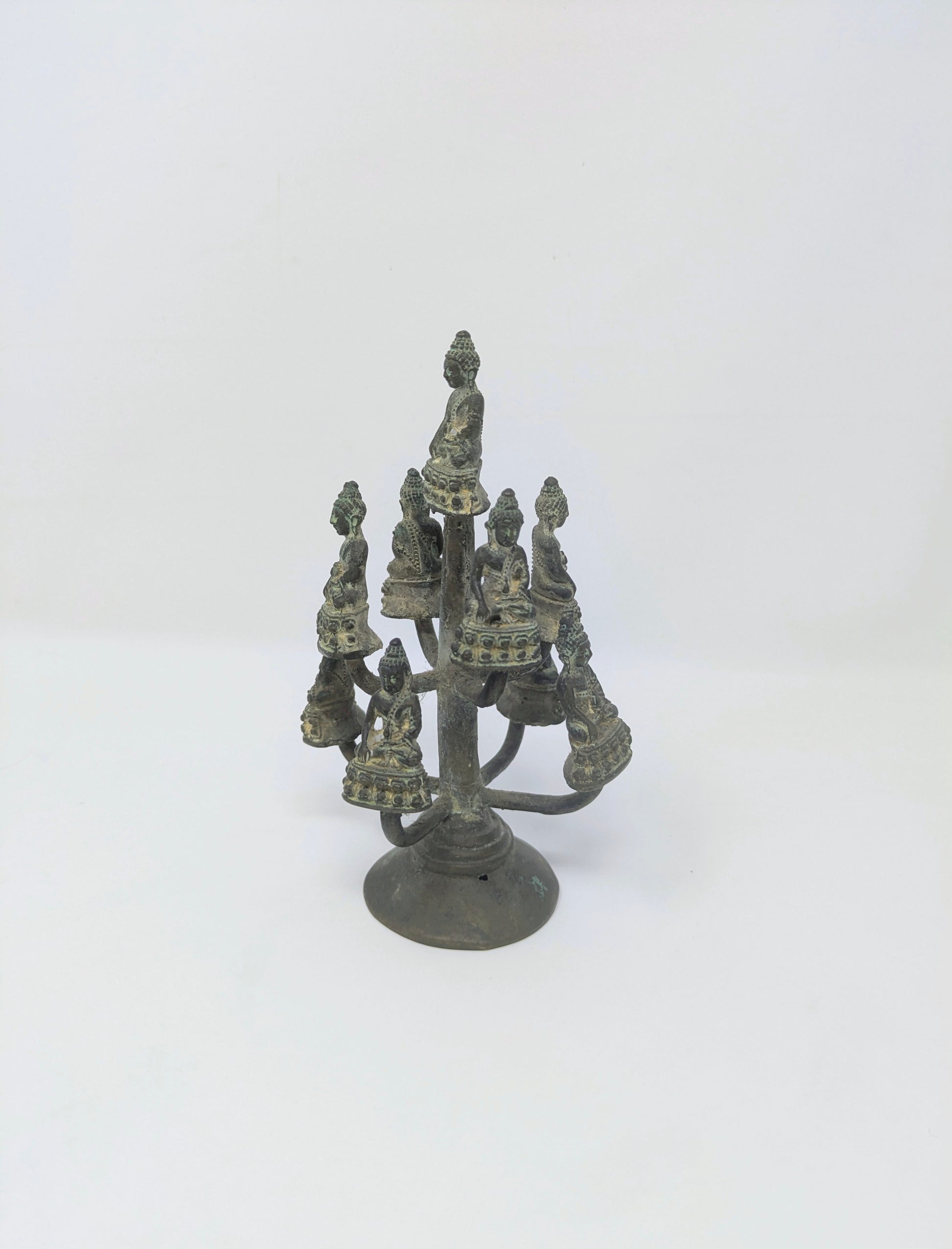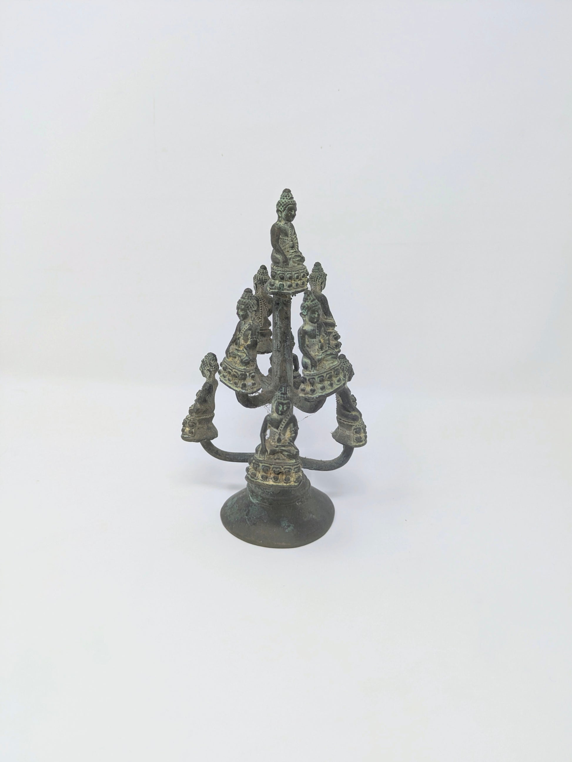 Traveling Man Treasures is selling this early 20th century Thai bronze sculpture depicting nine Amitabha Buddhas positioned around a central Bodhi tree. This sculpture features elements of the Sukhothai style, a renowned period in Thai art history known for its elegant and serene Buddha images.