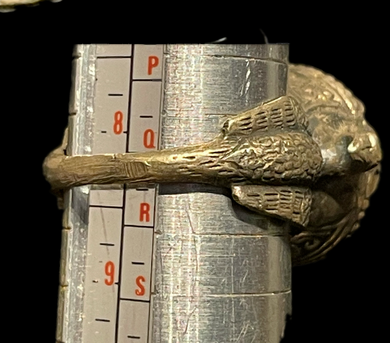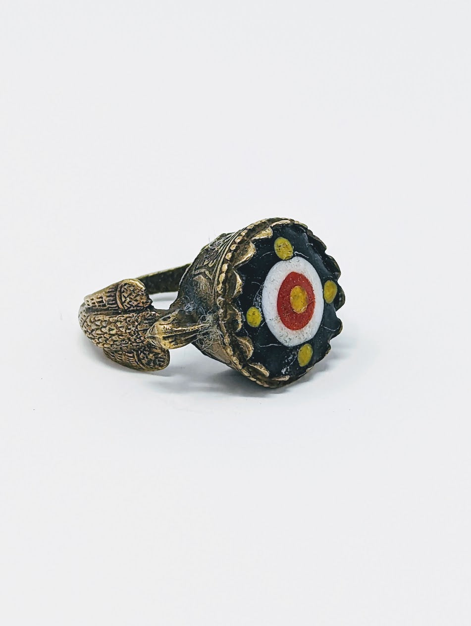 Truly stunning, this ancient Phoenician ring bears a black glass center-stone and a finely crafted gold-gilt metal band. The band is designed as two connected bird-like creatures encasing the black, red, white, and yellow glass center-stone. This magnificent ancient gold-gilt Phoenician glass ring is ready to be proudly displayed at home, looped onto a necklace as a pendant, or worn on a finger as a one-of-a-kind statement piece.