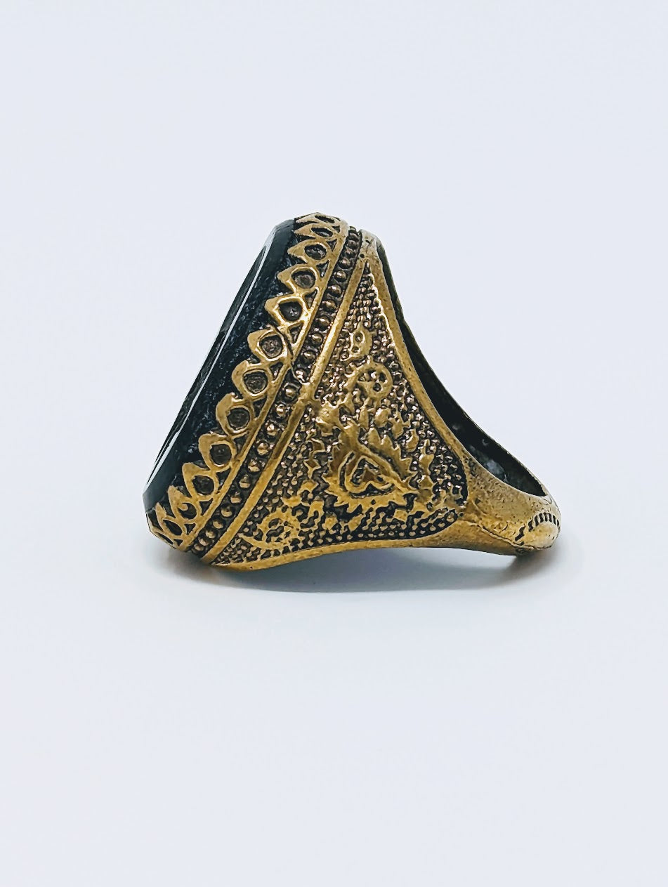 This beautiful gold-gilt ancient Near Eastern black agate ring bears an intaglio inscribed face as its centerpiece (the original owner?) fully displaying the artisan's mesmerizing decorative skill and use of masculine themes. Use this ring as a display piece, a pendant, or even as a rare wearable artifact!