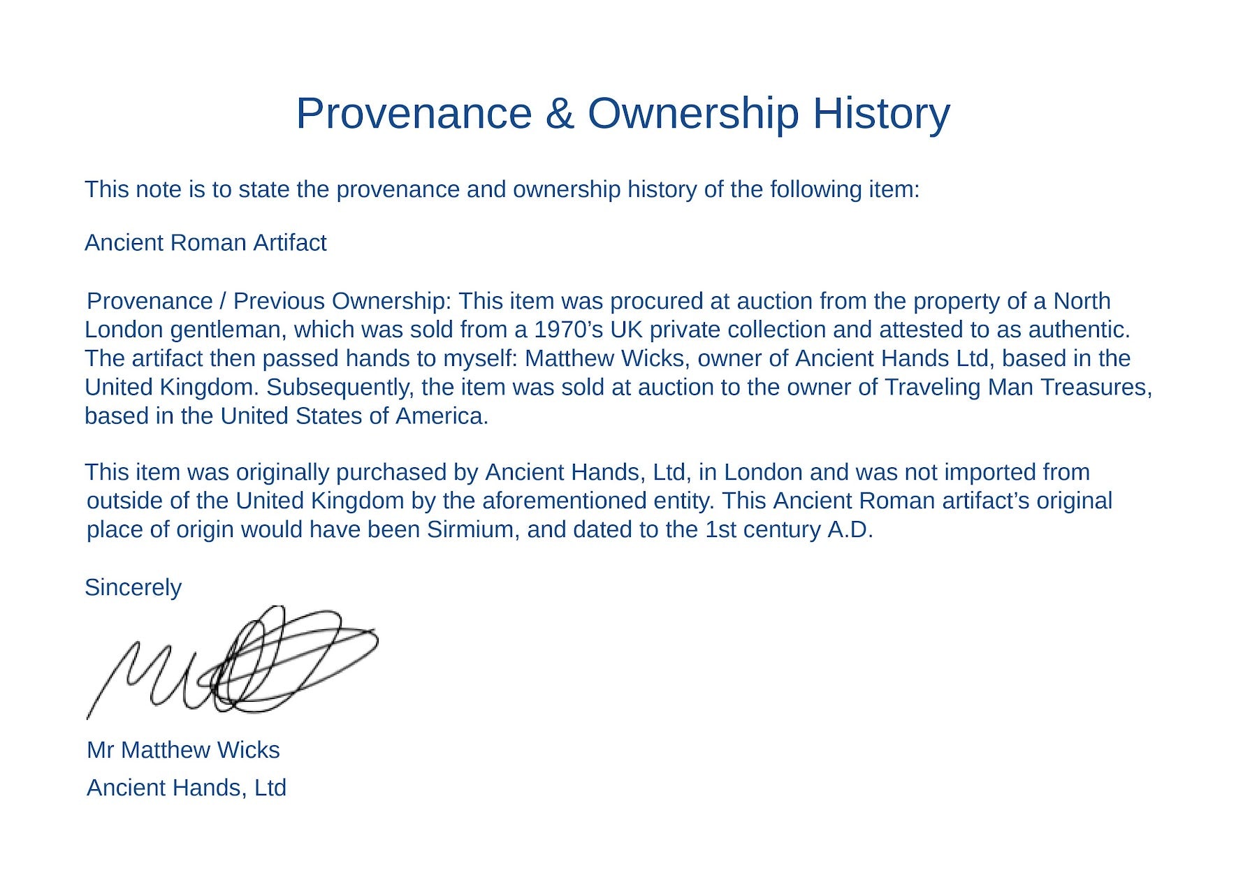 This antique Roman ring is attested as made by Italian artisans in Rome during the “Grand Tour” period (1780s-1920s) by Mr. Matthew Wicks of Ancient Hands LTD, and accompanied by a signed “Provenance & Ownership” document.