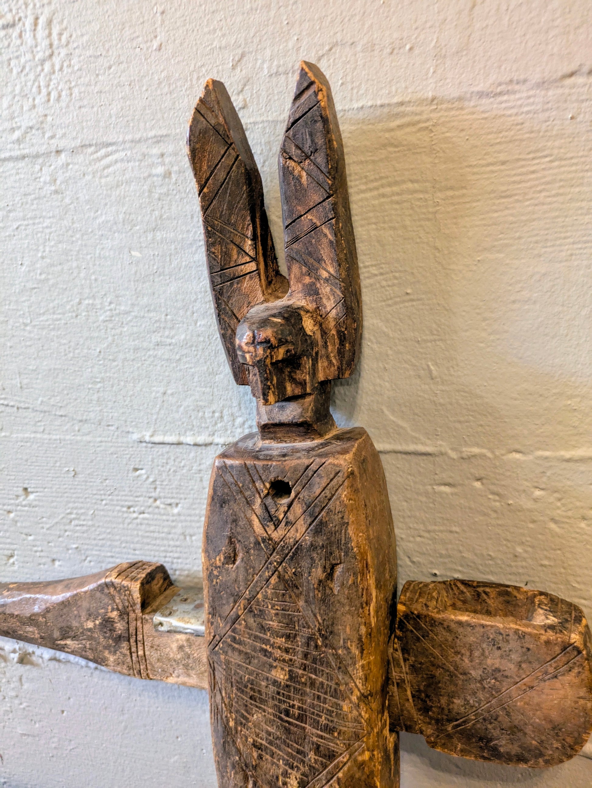 This is a unique Bamana door lock from Mali, West Africa. These locks are more than just functional items; they are also significant cultural objects. These pieces are used to secure homes, granaries, and sanctuaries, providing both physical and spiritual security. The figure on the lock is believed to offer protection from bad spirits, and features geometric forms and intricate incised marks.