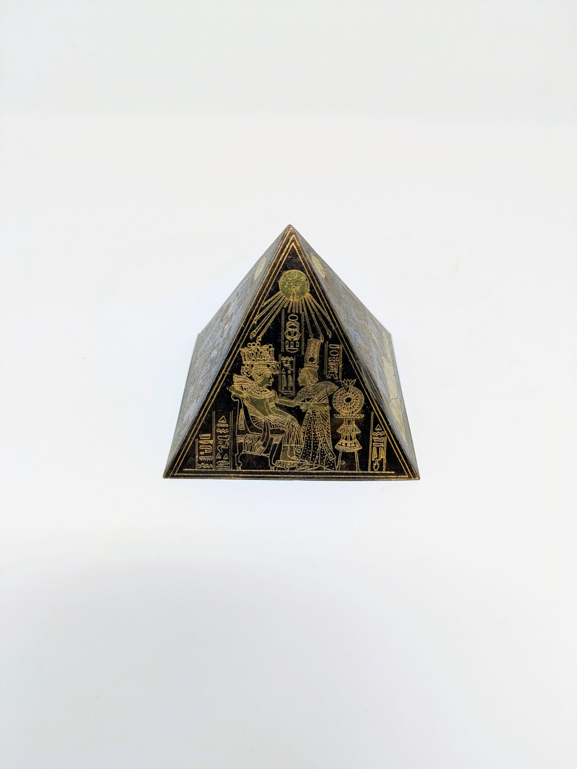 Traveling Man Treasures is selling this vintage Egyptian Revival etched brass inlay pyramid paperweight/decor piece. Crafted in Egypt, these handmade paperweights are a perfect addition to any collection of Egyptian culture and history, and can also be used strictly for decorative purposes.