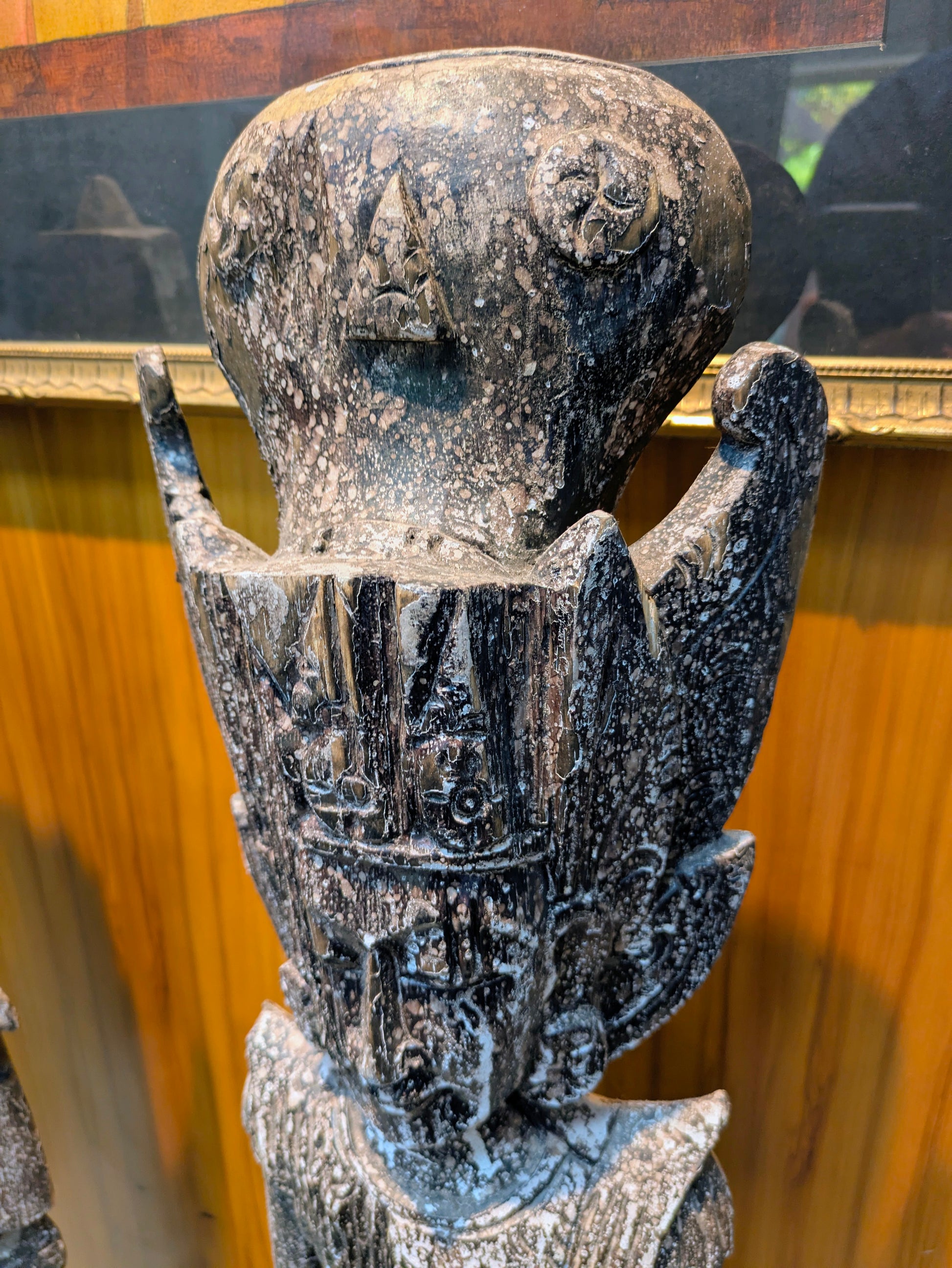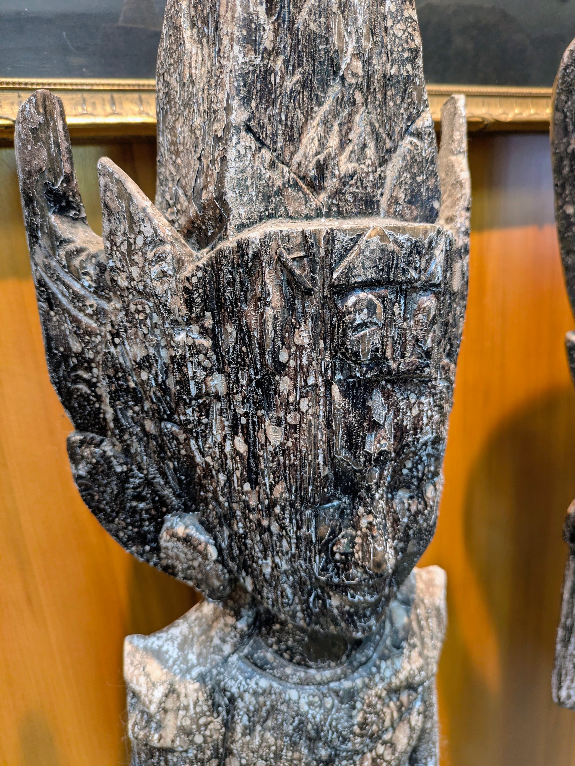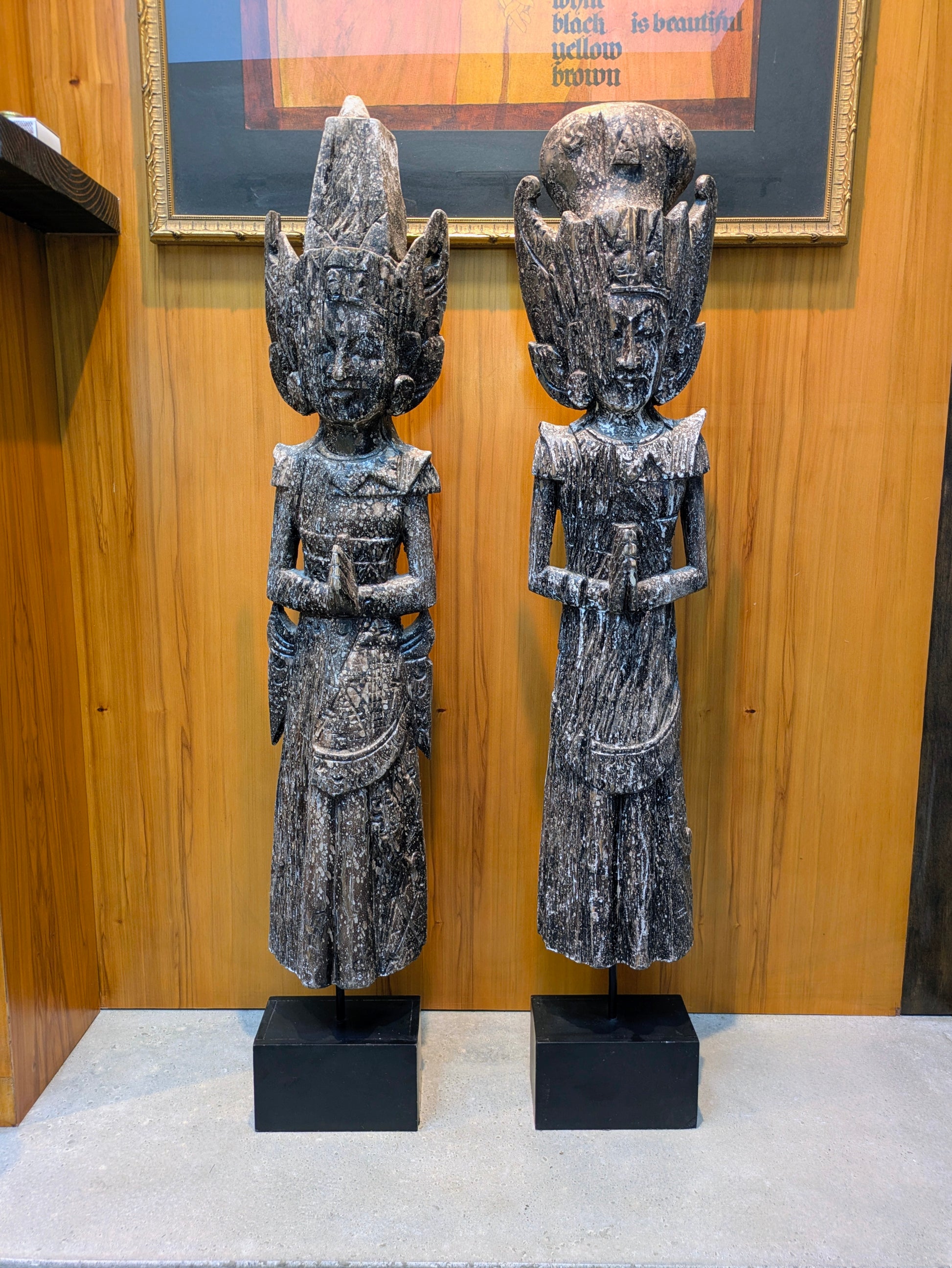 Traveling Man Treasures is selling this 40.5" tall pair of vintage statues depicting the Hindu Deities Sita and Rama. These lightweight wooden statues are intentionally distressed to look much older than they are (c. 1980s) and are in good overall condition, although the bases do have small imperfections.