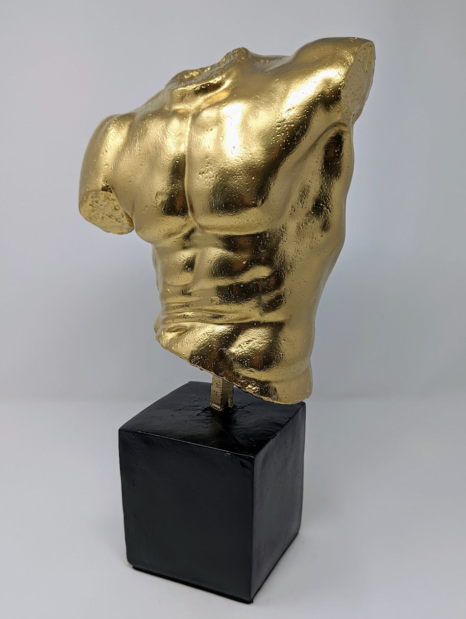 This sculpture is a vintage reproduction of the acclaimed Russian-American sculptor, Sergey Eylanbekov's masterpiece, "Male Torso." The elegant sculpture has the classical Greco-Roman styling and is made of a composite resin and depicts a muscular male torso painted in a brilliant gold-tone and mounted on a solid black resin base.
