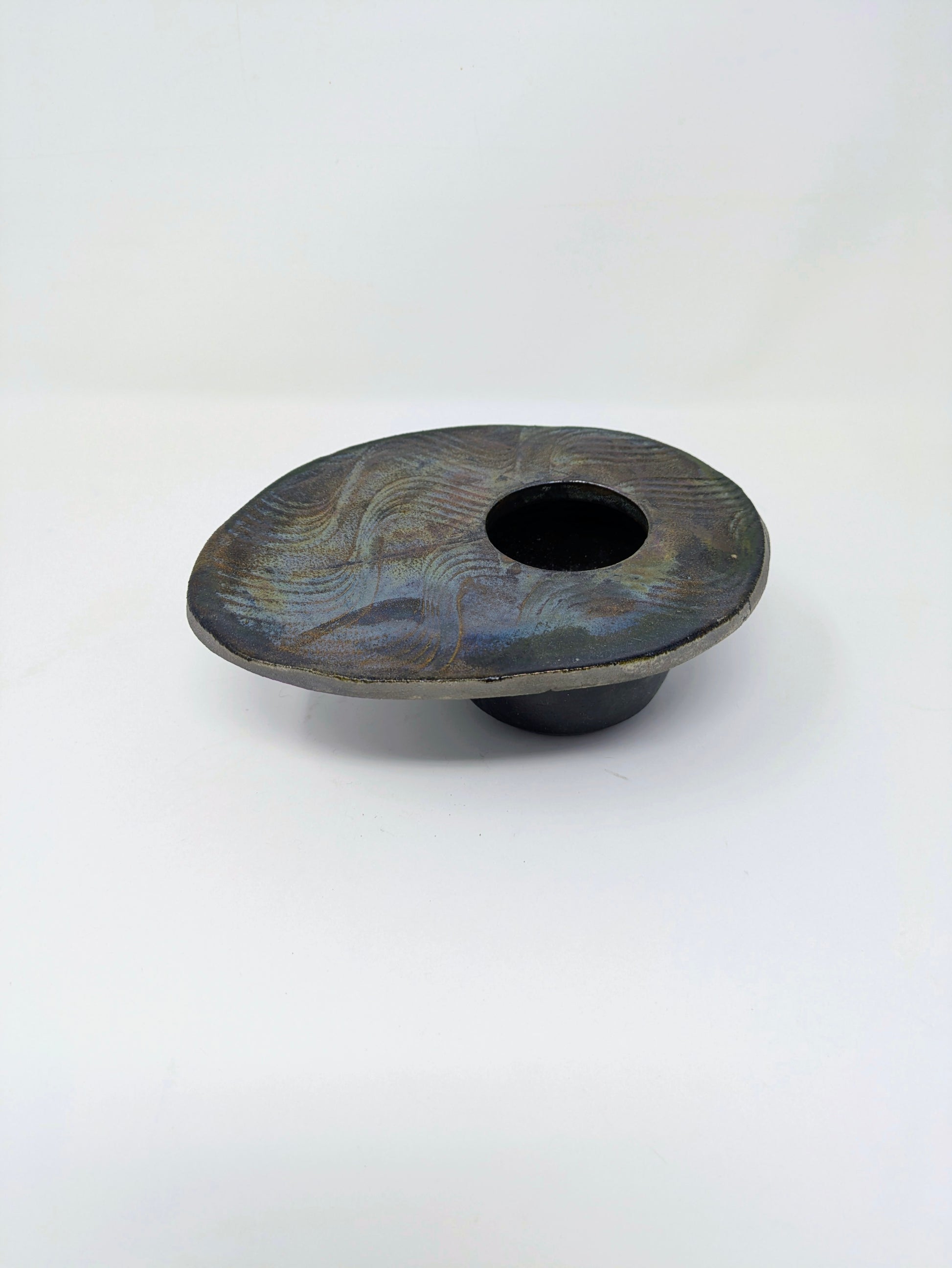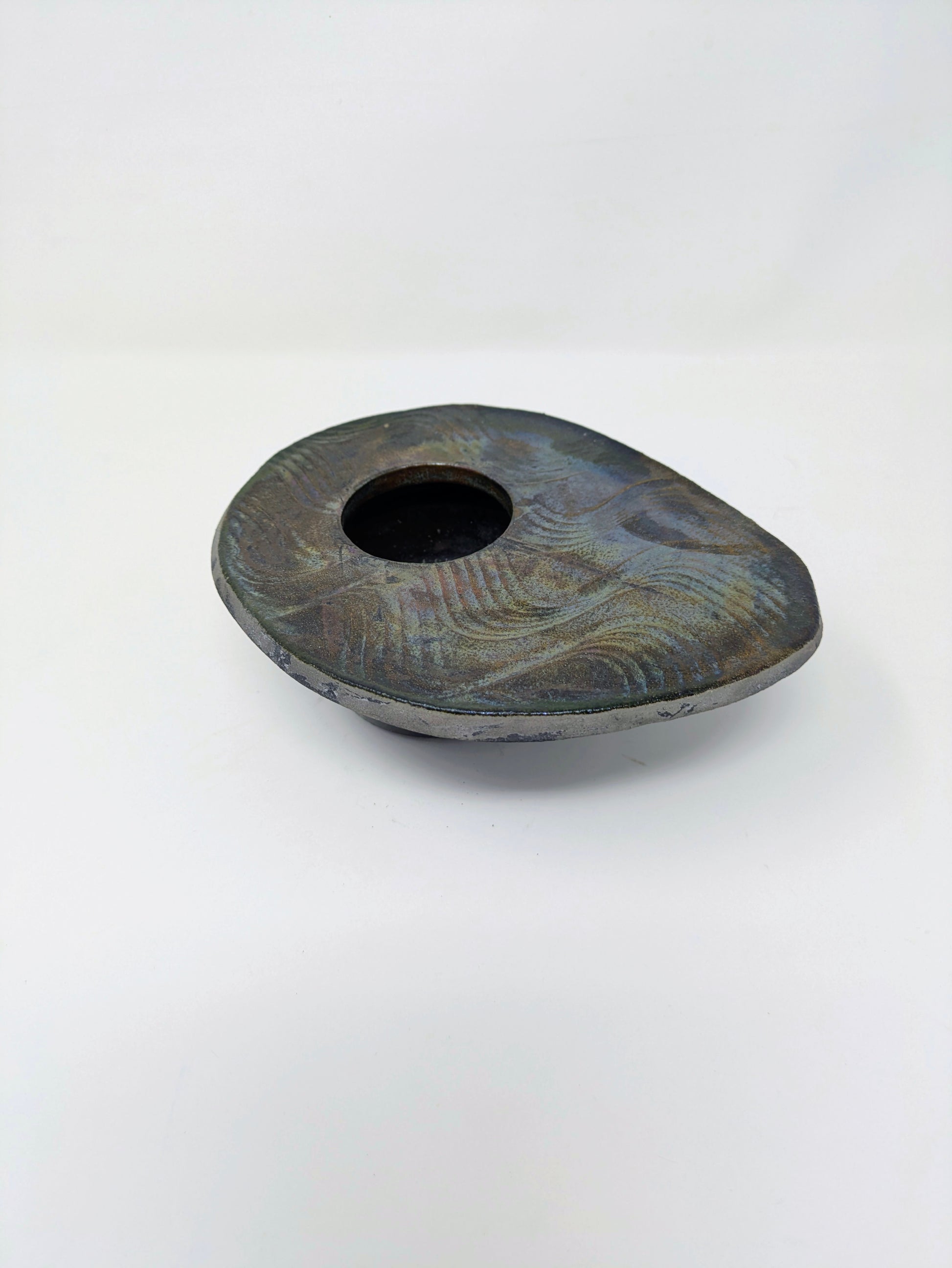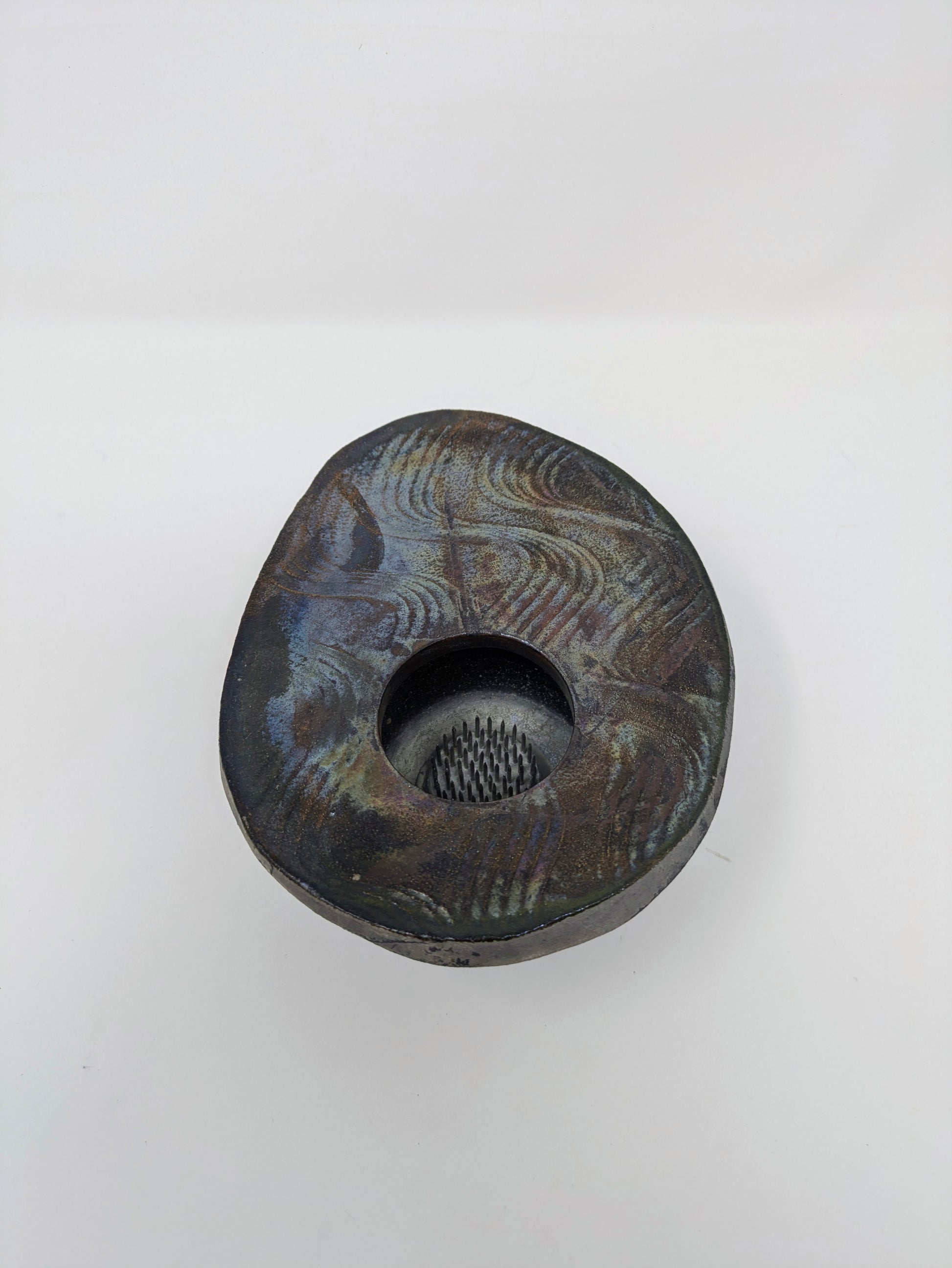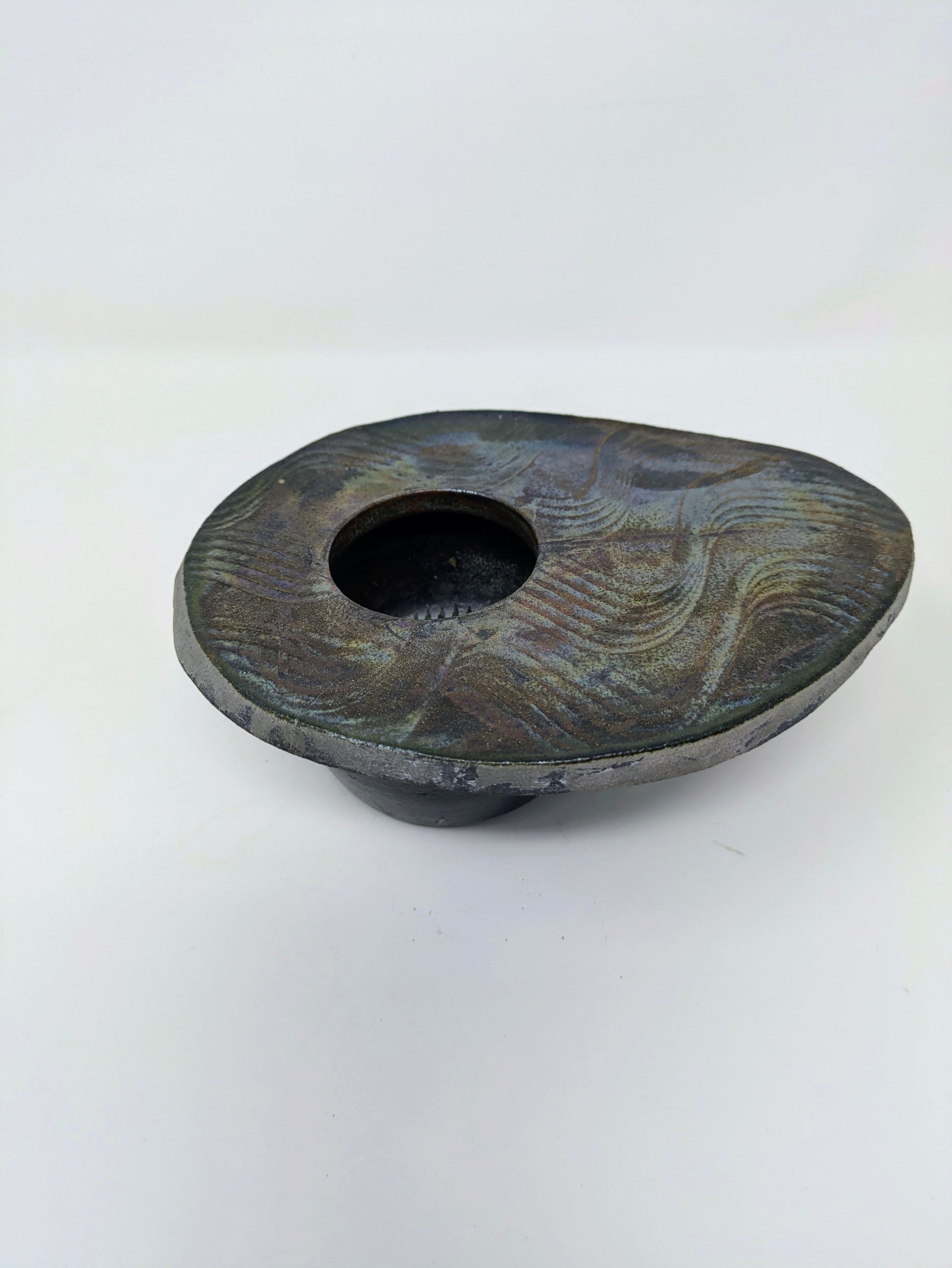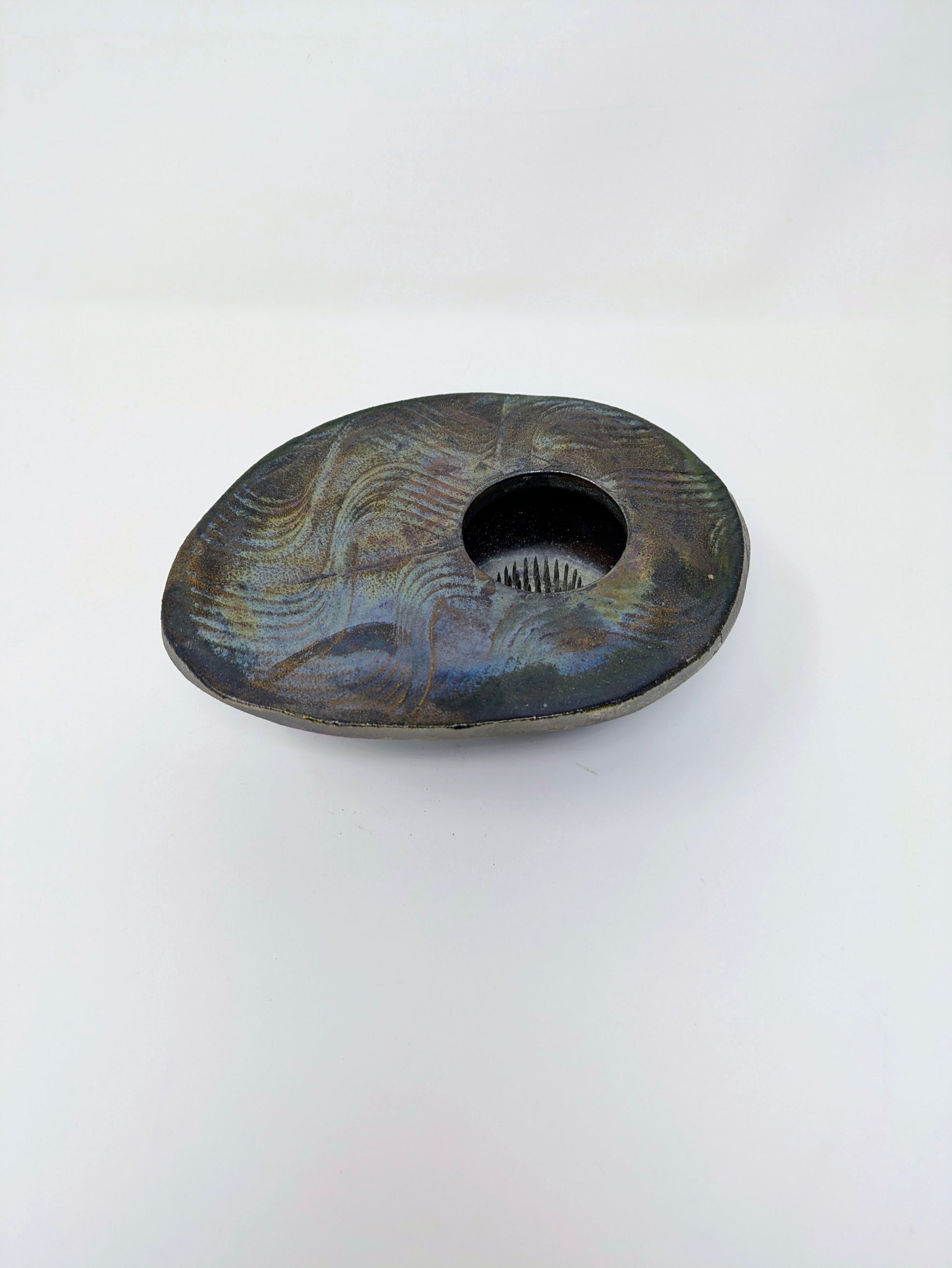 This particular vase has a distinctive abstract, pebble-like or lentil shape with a central opening, including a kenzan (or flower frog) inside to hold the flower stems in place. The shallow, wide basin design of this type of vase is considered easy for beginners to use in traditional Ikebana, allowing for arrangements that emphasize horizontal lines and the interplay of flowers and water.